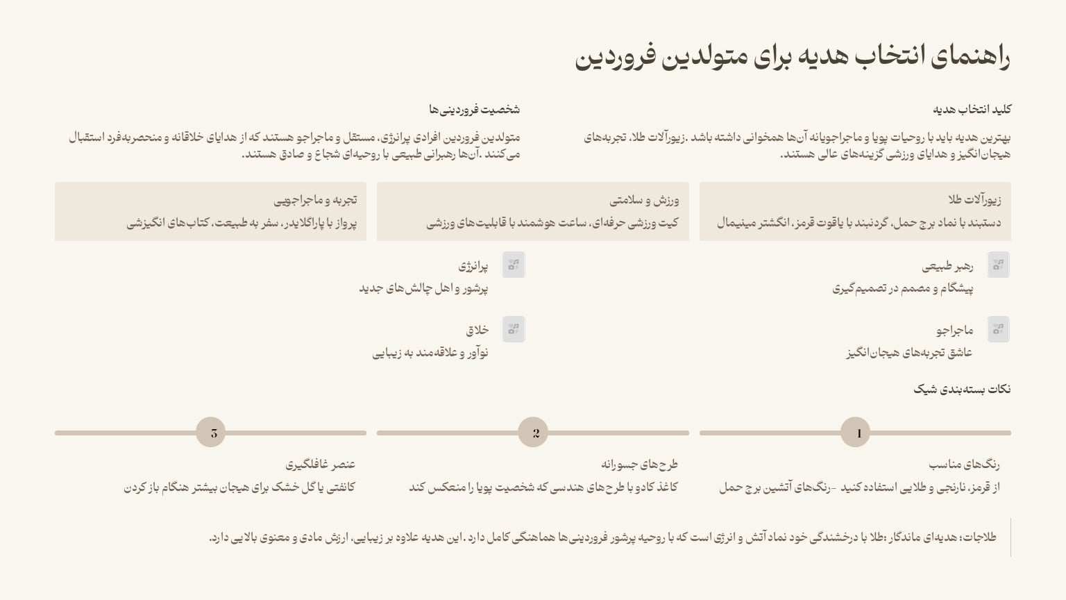 | تجربههای هیجانانگیز | پرواز با پاراگلایدر، بانجی جامپینگ، غواصی یا کلاسهای ورزشی پرهیجان | هدیهای بهیادماندنی برای روحیه ماجراجویانه فروردینیها. |